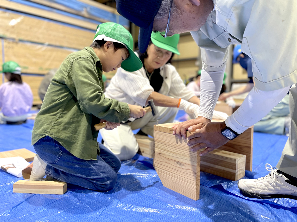 午後からは工場スタッフや大工スタッフのサポートのもと、親子で協力して本立てづくりに挑戦しました。