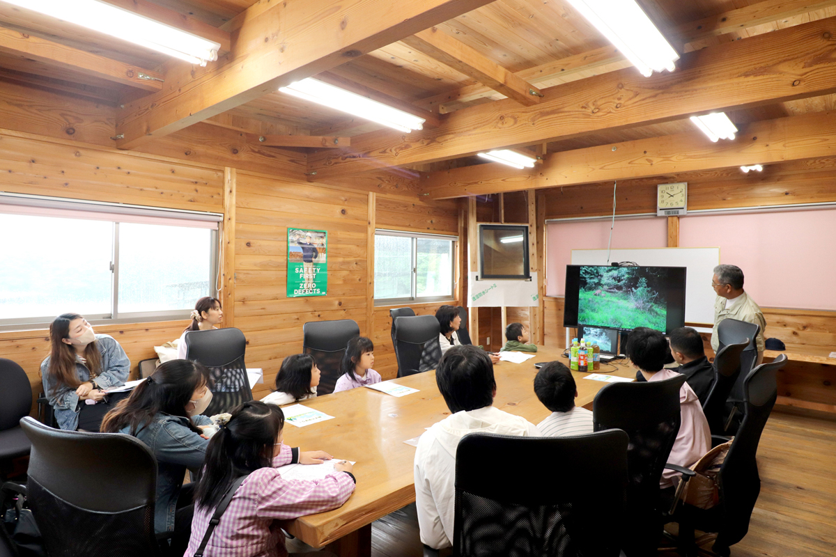 あいにくの雨天により、午前中に予定されていた里山ツアーは中止となりましたが、代わりに室内にて里山に関する紹介動画の視聴と座学を実施。子どもたちは熱心にメモを取りながら、里山の生態系や山林の大切さについて学びました。